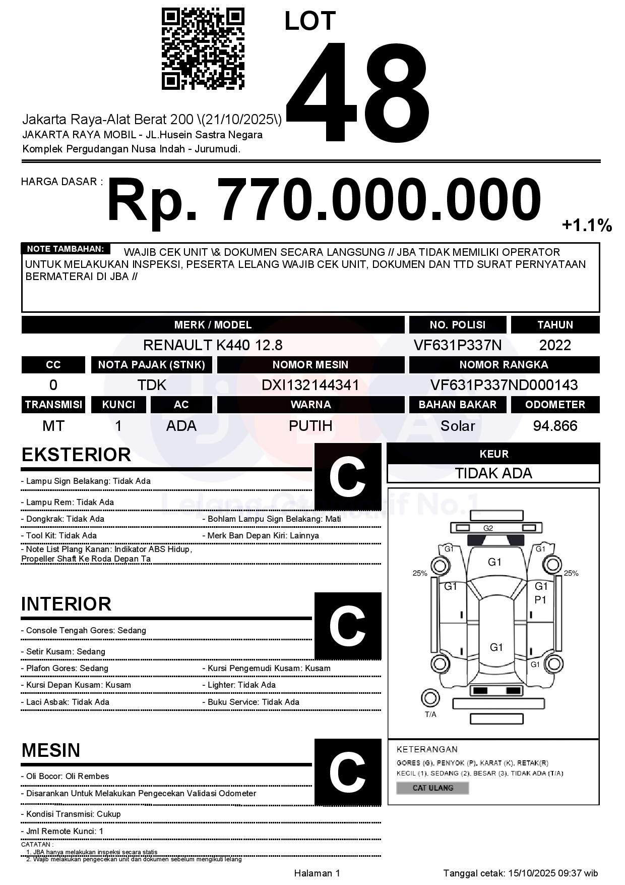 - CatatanWAJIB CEK UNIT & DOKUMEN SECARA LANGSUNG // JBA TIDAK MEMILIKI OPERATOR UNTUK MELAKUKAN INSPEKSI, PESERTA LELANG WAJIB CEK UNIT, DOKUMEN DAN TTD SURAT PERNYATAAN BERMATERAI DI JBA //