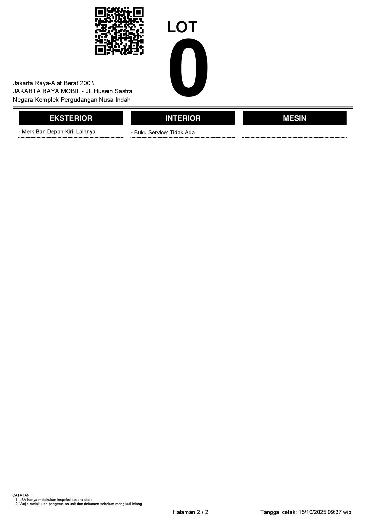 - CatatanWAJIB CEK UNIT & DOKUMEN SECARA LANGSUNG // JBA TIDAK MEMILIKI OPERATOR UNTUK MELAKUKAN INSPEKSI, PESERTA LELANG WAJIB CEK UNIT, DOKUMEN DAN TTD SURAT PERNYATAAN DI JBA