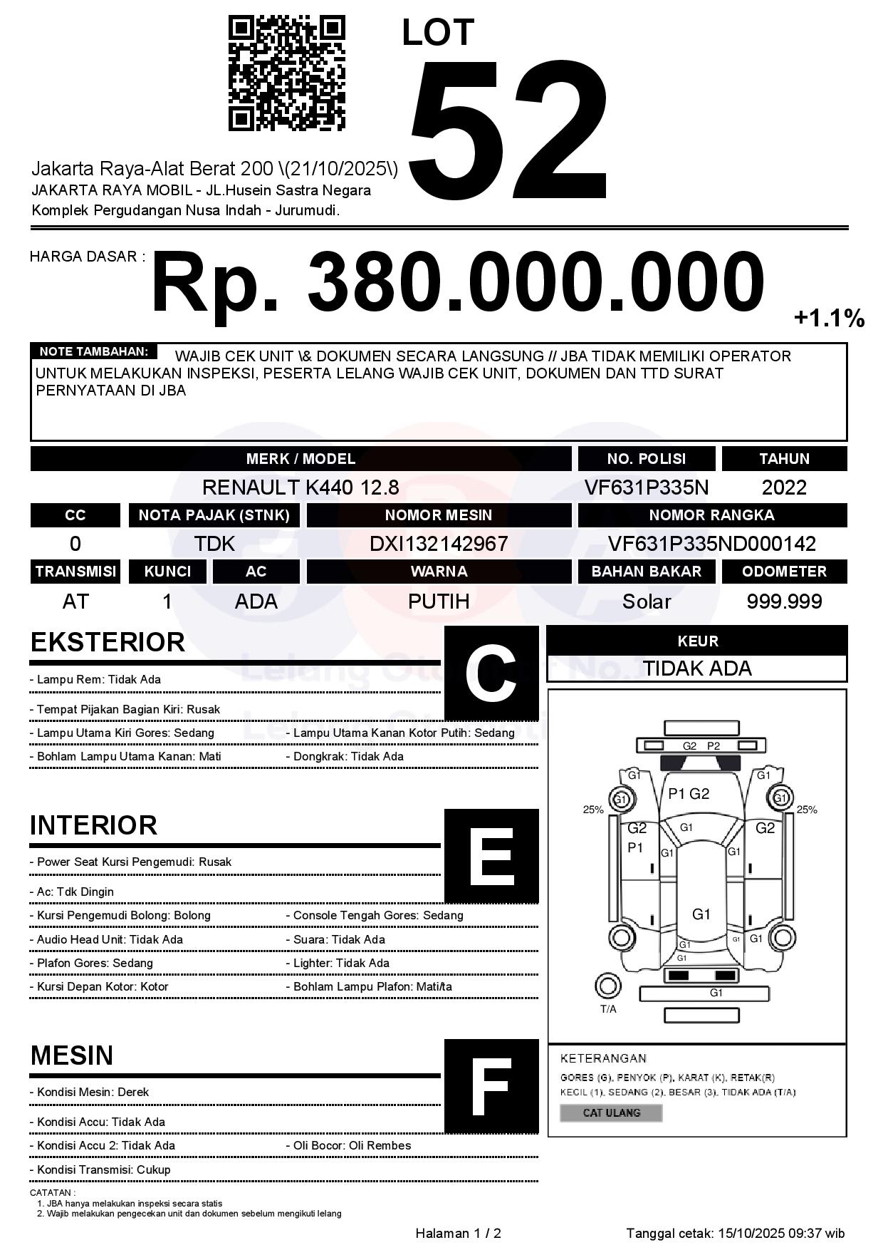 - CatatanWAJIB CEK UNIT & DOKUMEN SECARA LANGSUNG // JBA TIDAK MEMILIKI OPERATOR UNTUK MELAKUKAN INSPEKSI, PESERTA LELANG WAJIB CEK UNIT, DOKUMEN DAN TTD SURAT PERNYATAAN DI JBA