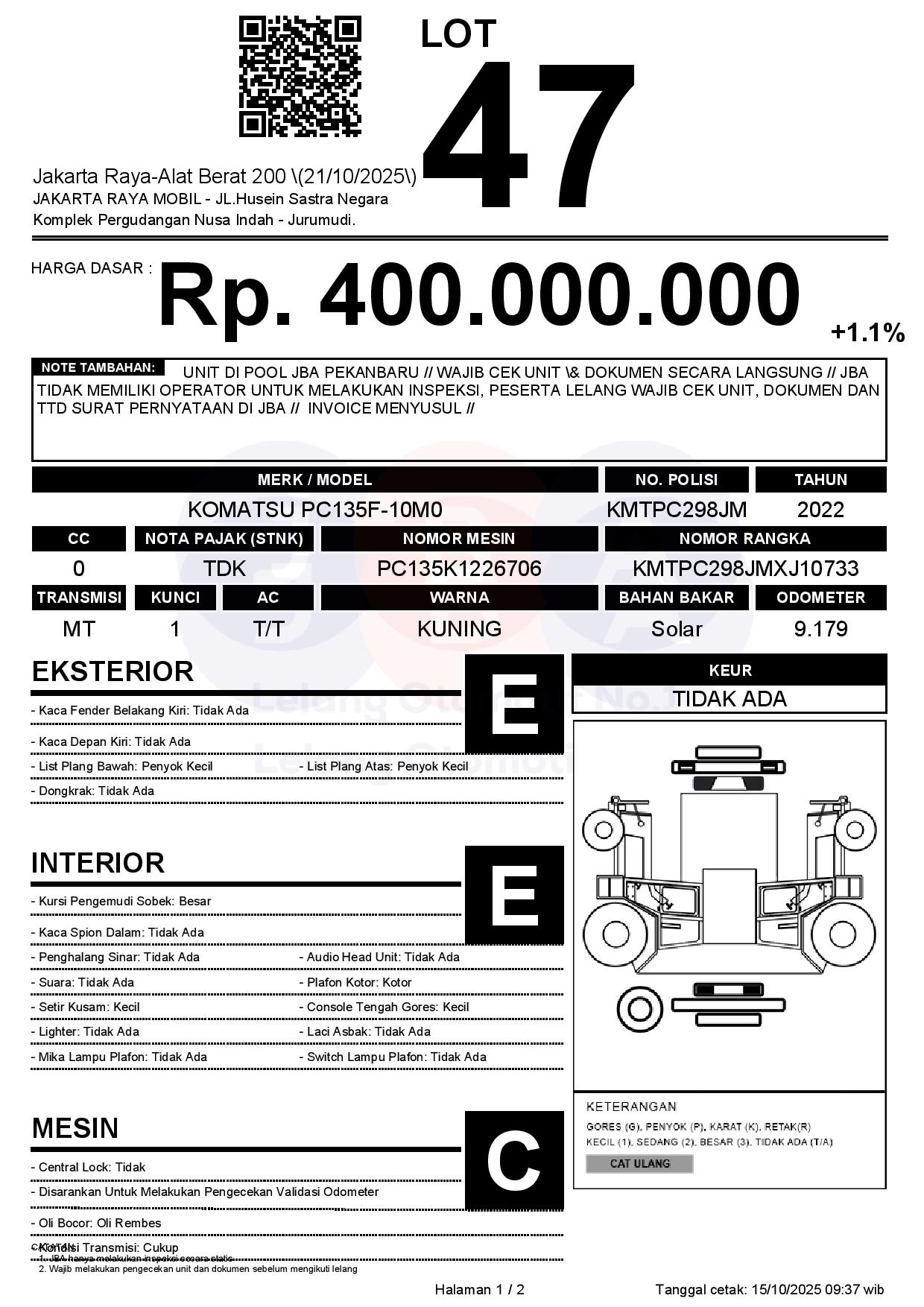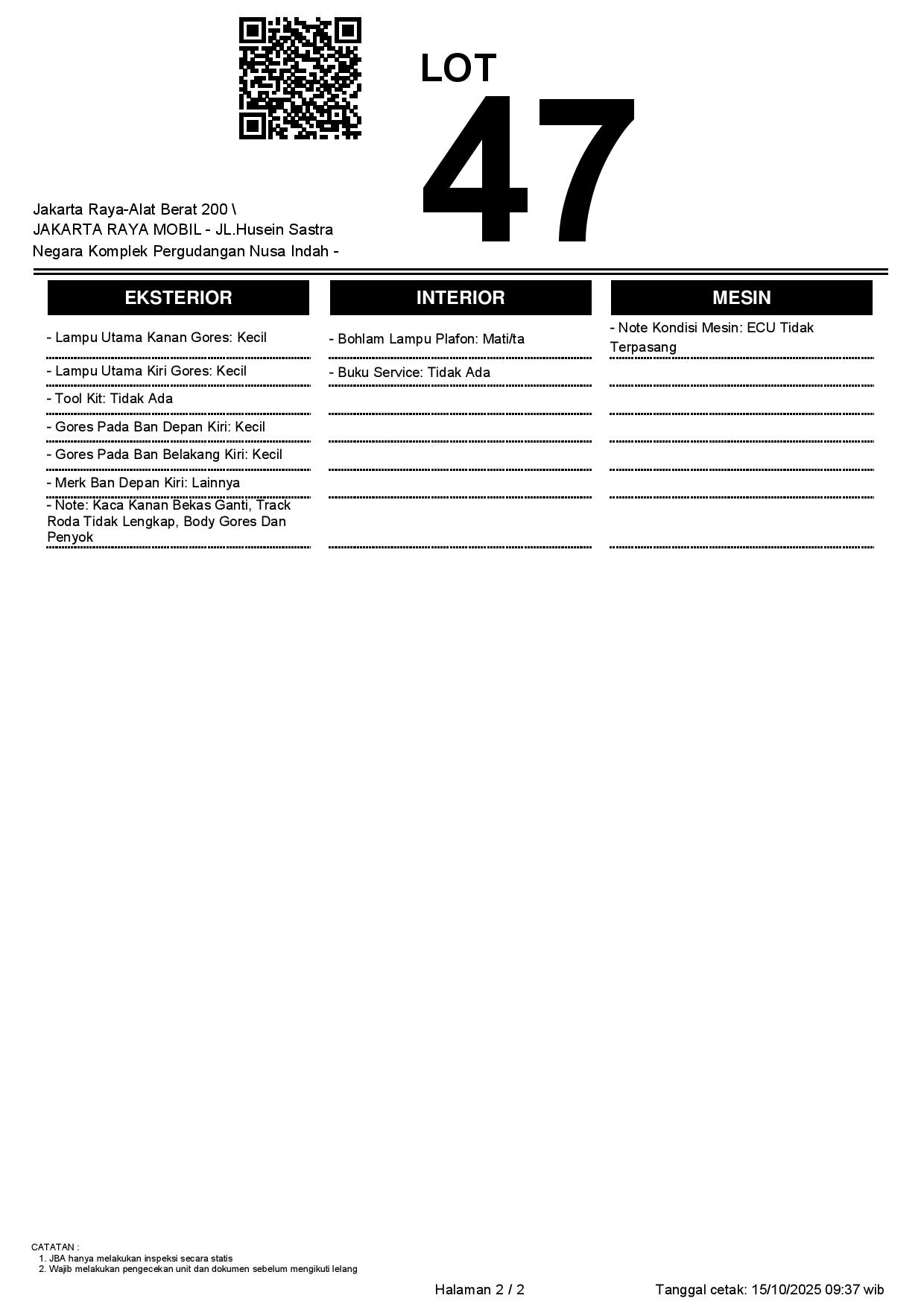 - CatatanUNIT DI POOL JBA PEKANBARU // WAJIB CEK UNIT & DOKUMEN SECARA LANGSUNG // JBA TIDAK MEMILIKI OPERATOR UNTUK MELAKUKAN INSPEKSI, PESERTA LELANG WAJIB CEK UNIT, DOKUMEN DAN TTD SURAT PERNYATAAN DI JBA // INVOICE MENYUSUL //