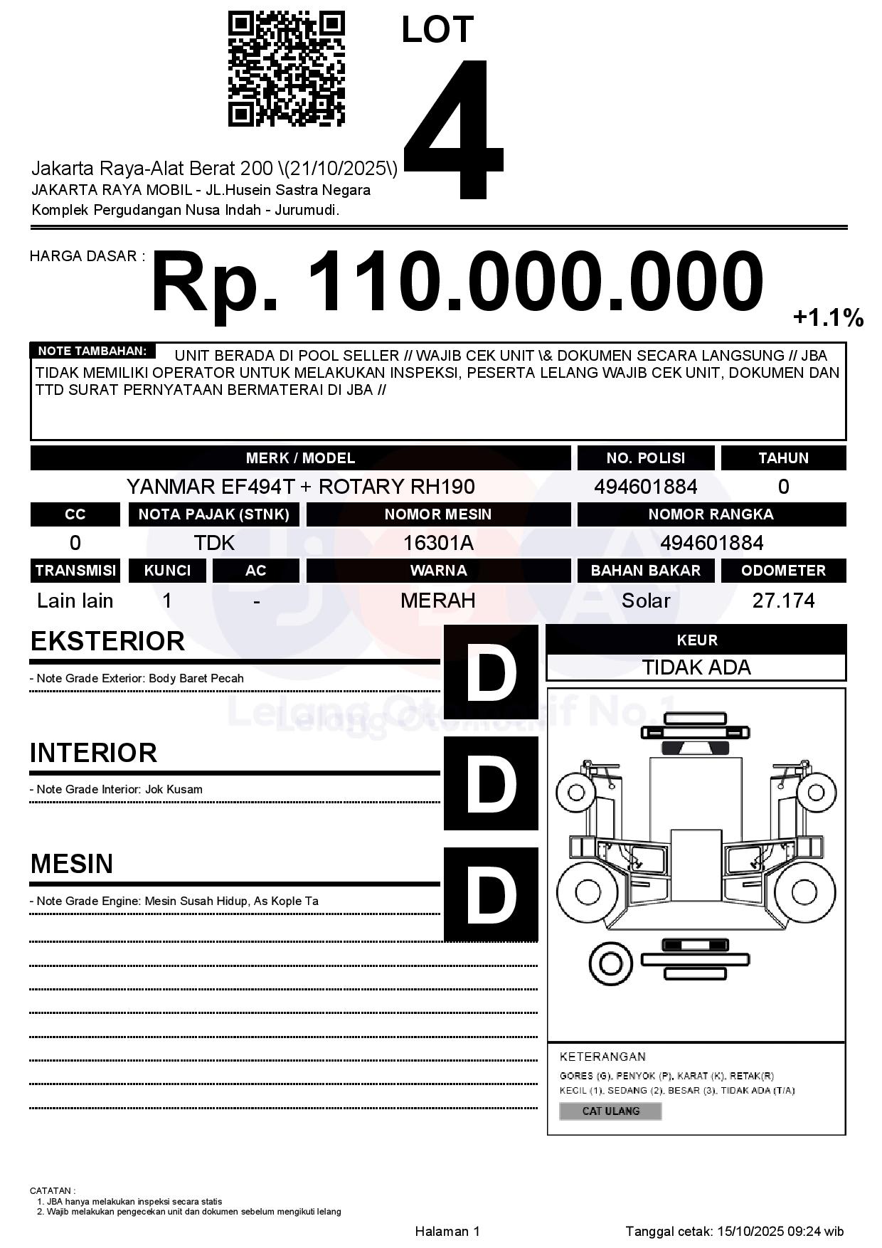 - CatatanUNIT BERADA DI POOL SELLER // WAJIB CEK UNIT & DOKUMEN SECARA LANGSUNG // JBA TIDAK MEMILIKI OPERATOR UNTUK MELAKUKAN INSPEKSI, PESERTA LELANG WAJIB CEK UNIT, DOKUMEN DAN TTD SURAT PERNYATAAN BERMATERAI DI JBA //