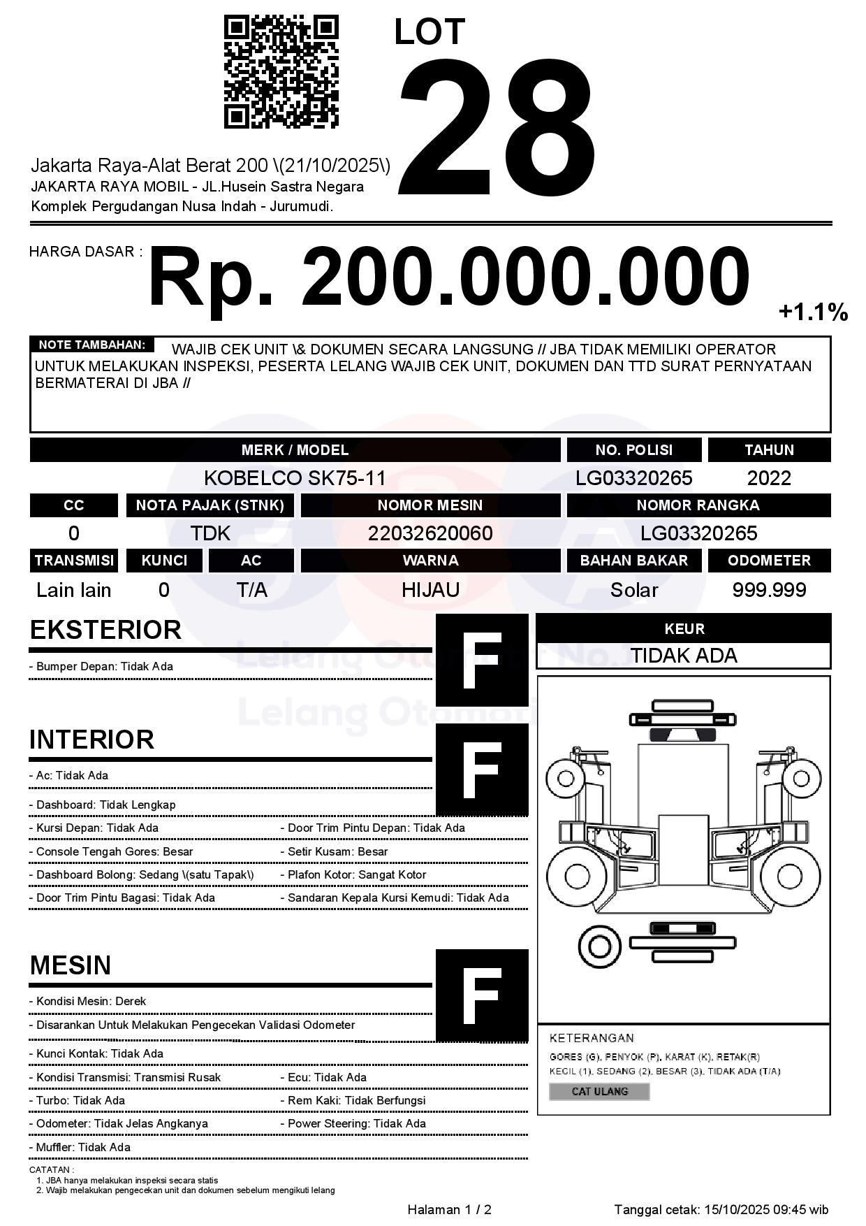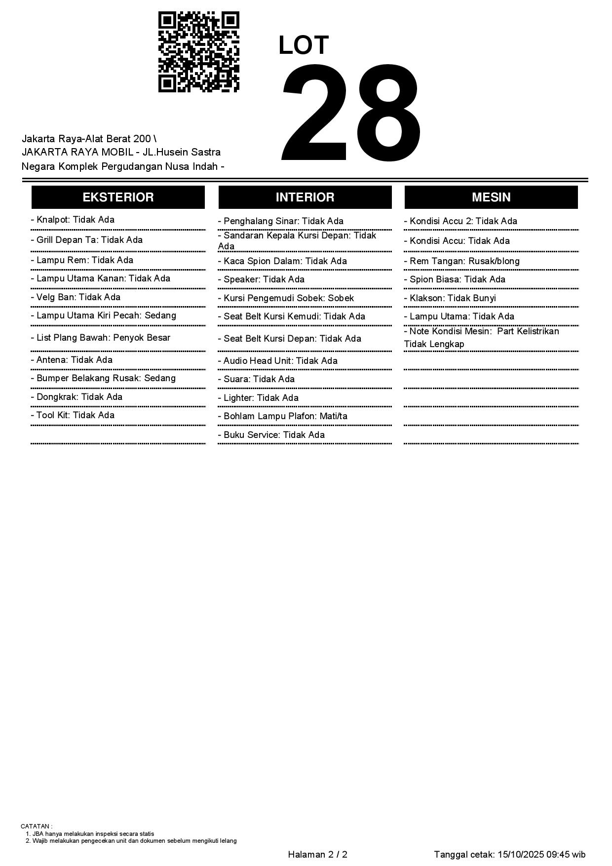 - CatatanWAJIB CEK UNIT & DOKUMEN SECARA LANGSUNG // JBA TIDAK MEMILIKI OPERATOR UNTUK MELAKUKAN INSPEKSI, PESERTA LELANG WAJIB CEK UNIT, DOKUMEN DAN TTD SURAT PERNYATAAN BERMATERAI DI JBA //