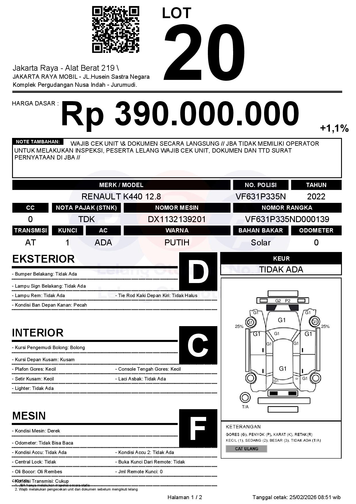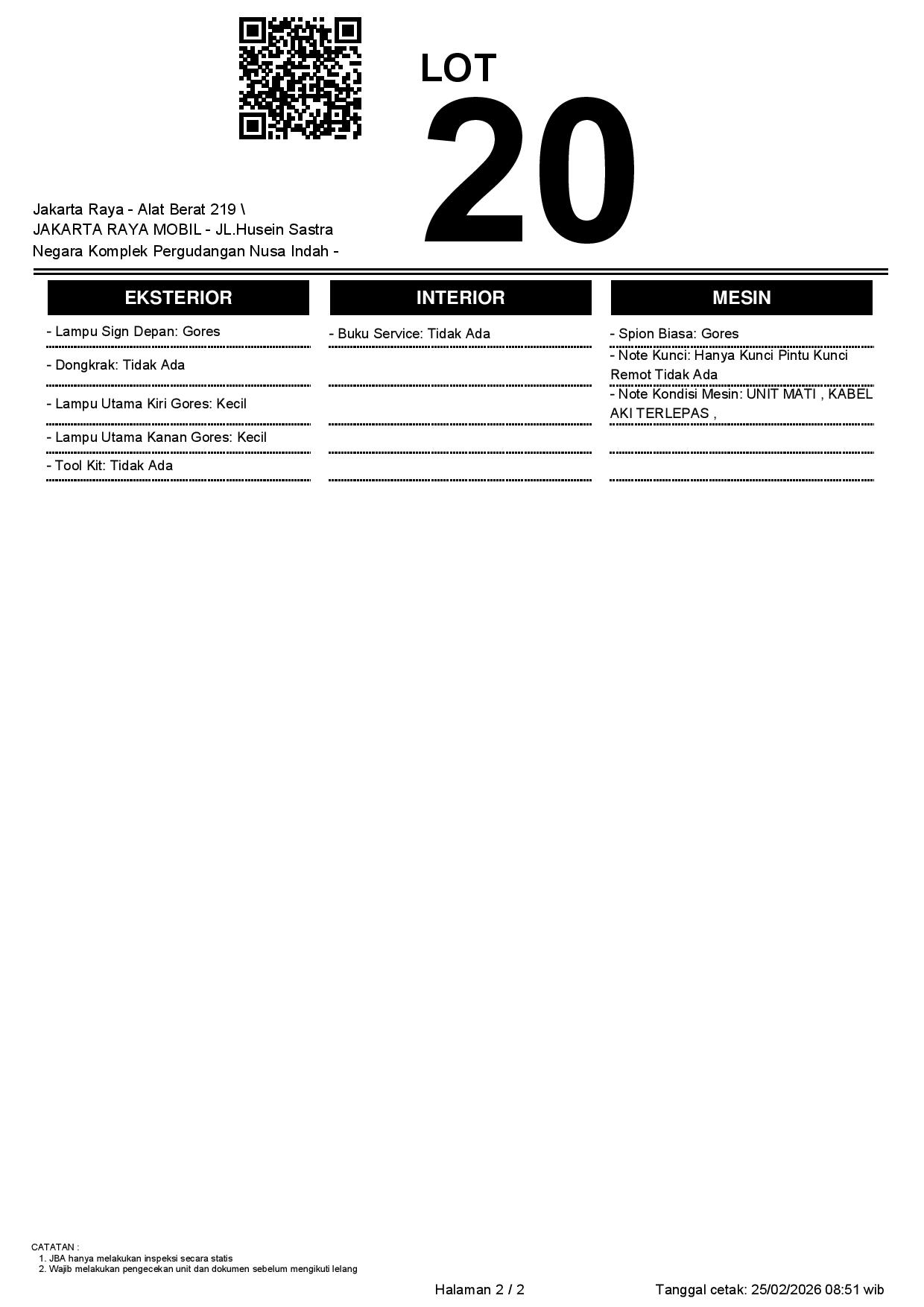 - CatatanWAJIB CEK UNIT & DOKUMEN SECARA LANGSUNG // JBA TIDAK MEMILIKI OPERATOR UNTUK MELAKUKAN INSPEKSI, PESERTA LELANG WAJIB CEK UNIT, DOKUMEN DAN TTD SURAT PERNYATAAN DI JBA //