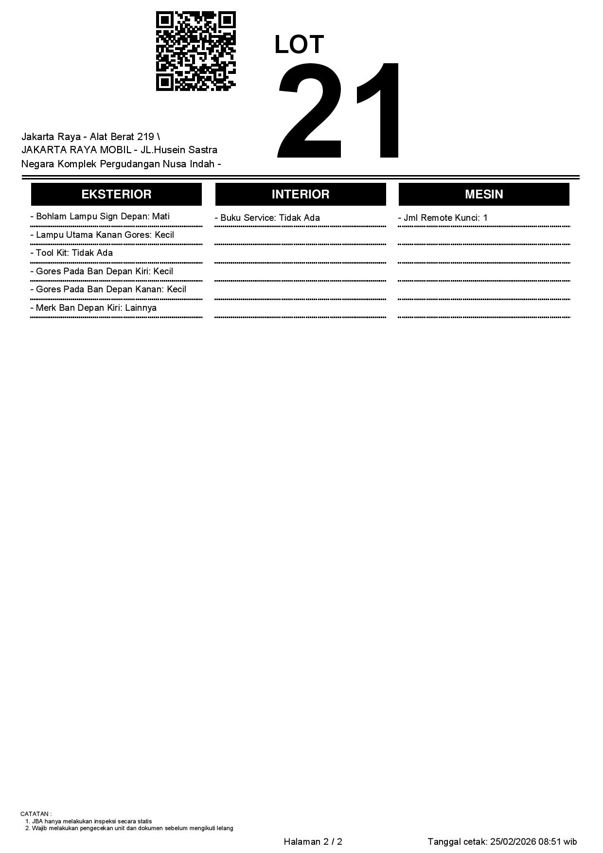 - CatatanWAJIB CEK UNIT & DOKUMEN SECARA LANGSUNG // JBA TIDAK MEMILIKI OPERATOR UNTUK MELAKUKAN INSPEKSI, PESERTA LELANG WAJIB CEK UNIT, DOKUMEN DAN TTD SURAT PERNYATAAN DI JBA