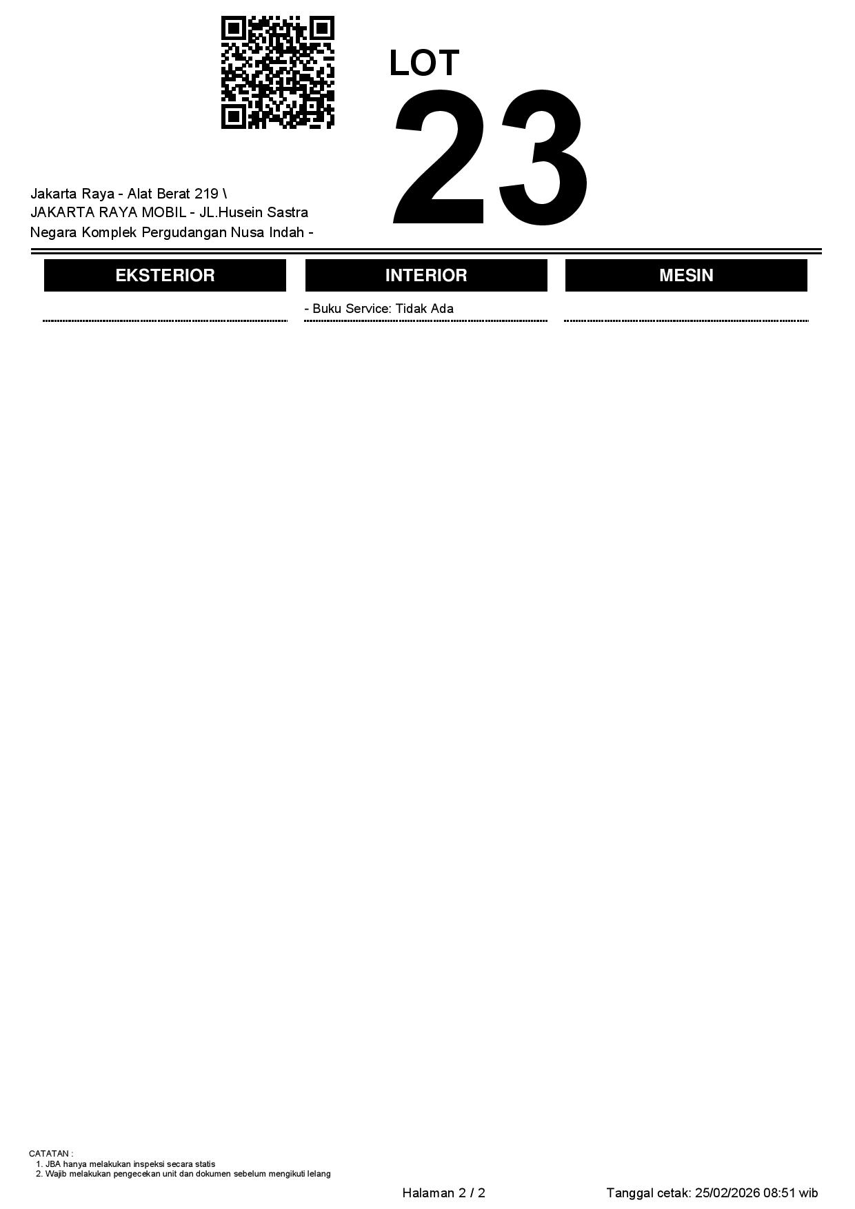 - CatatanWAJIB CEK UNIT & DOKUMEN SECARA LANGSUNG // JBA TIDAK MEMILIKI OPERATOR UNTUK MELAKUKAN INSPEKSI, PESERTA LELANG WAJIB CEK UNIT, DOKUMEN DAN TTD SURAT PERNYATAAN BERMATERAI DI JBA //