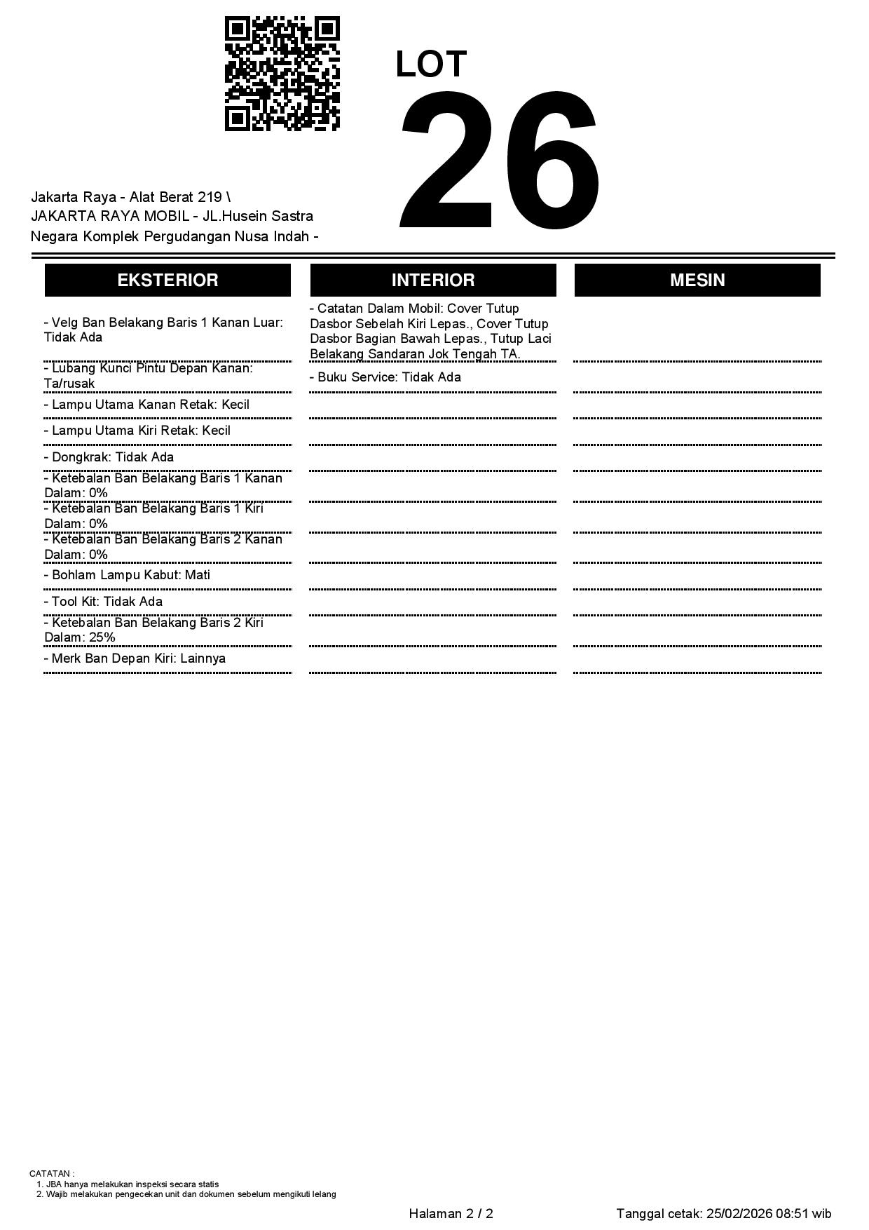 - CatatanKENDALA CEK SAMSAT // TNKB FISIK PALSU WARNA KUNING // WAJIB CEK UNIT & DOKUMEN SECARA LANGSUNG // JBA TIDAK MEMILIKI OPERATOR UNTUK MELAKUKAN INSPEKSI, PESERTA LELANG WAJIB CEK UNIT, DOKUMEN DAN TTD SURAT PERNYATAAN DI JBA