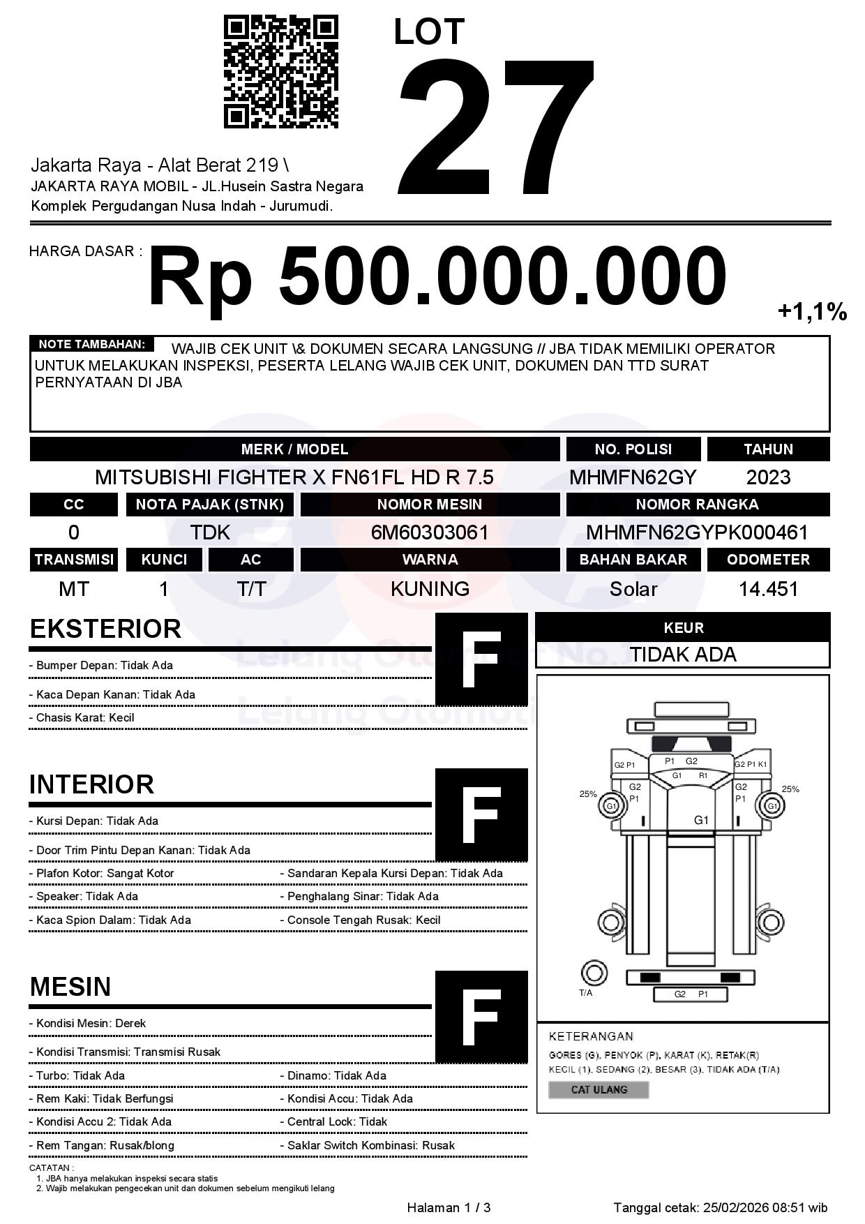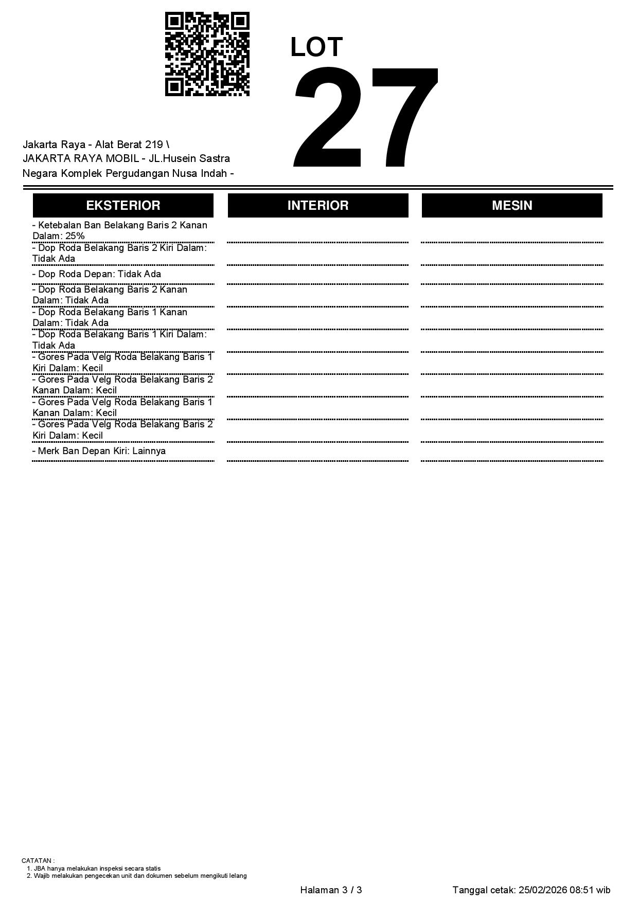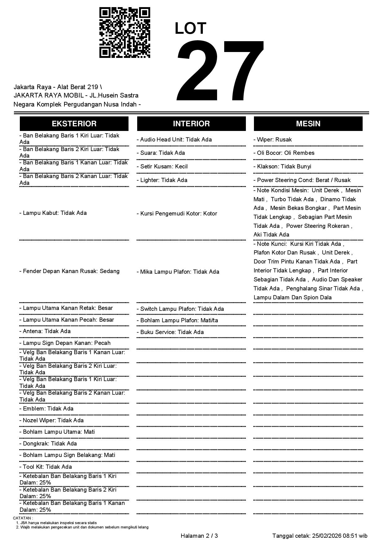 - CatatanWAJIB CEK UNIT & DOKUMEN SECARA LANGSUNG // JBA TIDAK MEMILIKI OPERATOR UNTUK MELAKUKAN INSPEKSI, PESERTA LELANG WAJIB CEK UNIT, DOKUMEN DAN TTD SURAT PERNYATAAN DI JBA