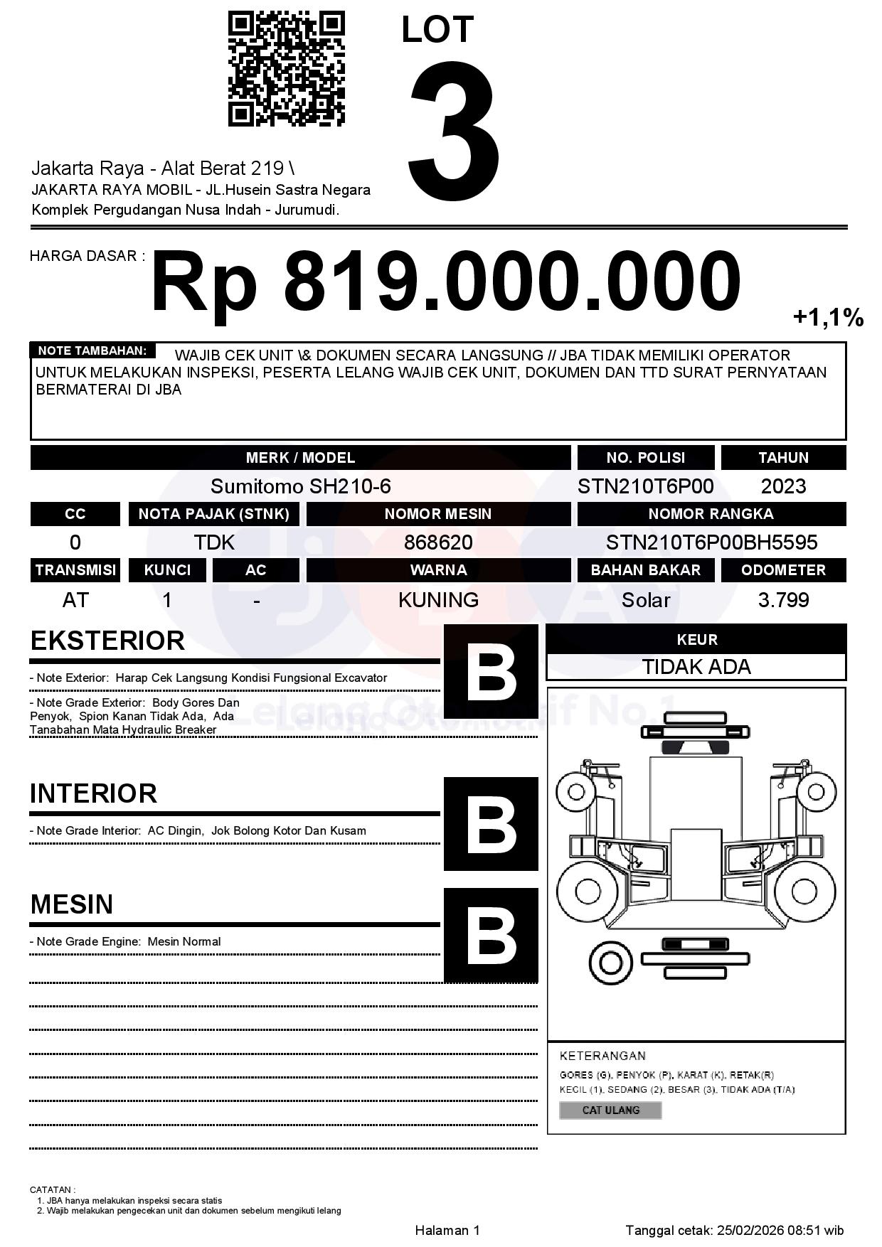 - CatatanWAJIB CEK UNIT & DOKUMEN SECARA LANGSUNG // JBA TIDAK MEMILIKI OPERATOR UNTUK MELAKUKAN INSPEKSI, PESERTA LELANG WAJIB CEK UNIT, DOKUMEN DAN TTD SURAT PERNYATAAN BERMATERAI DI JBA