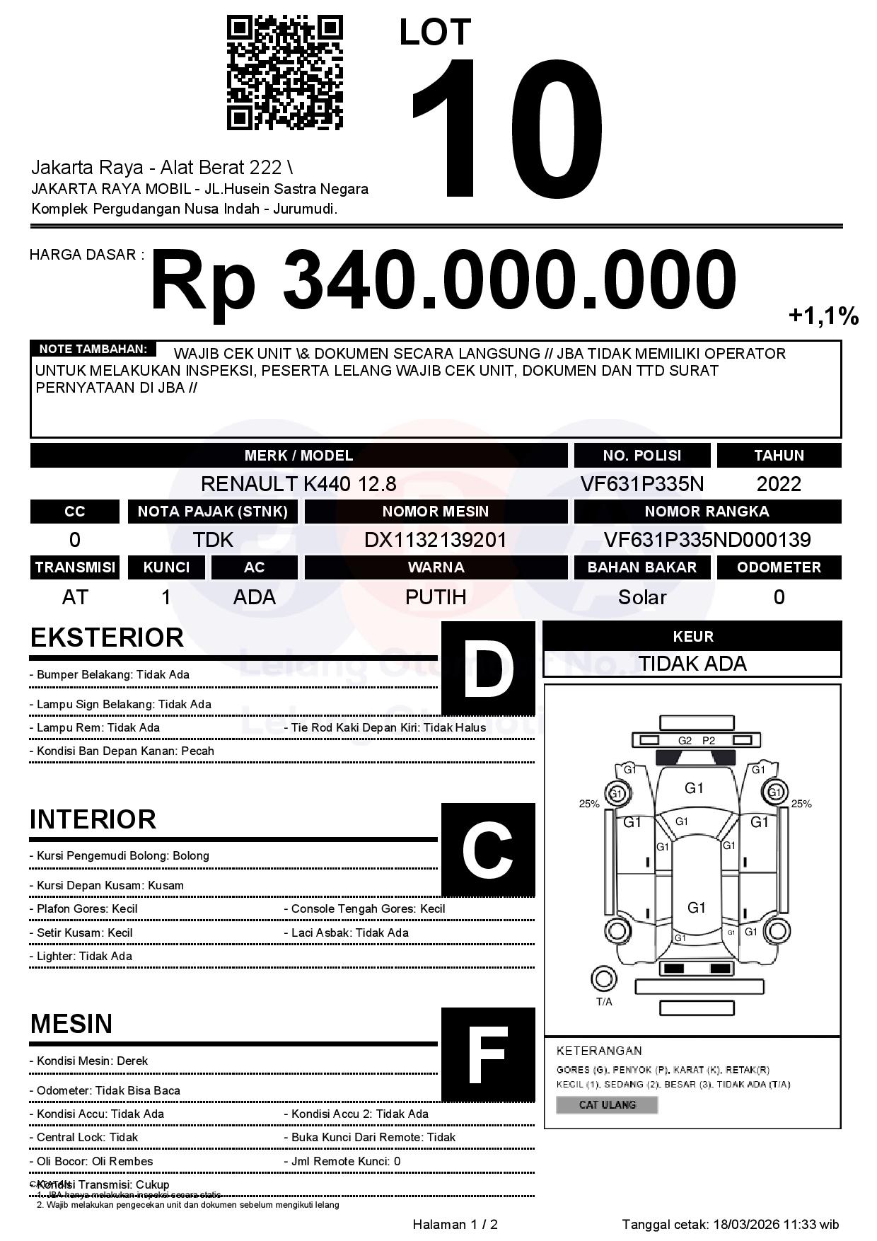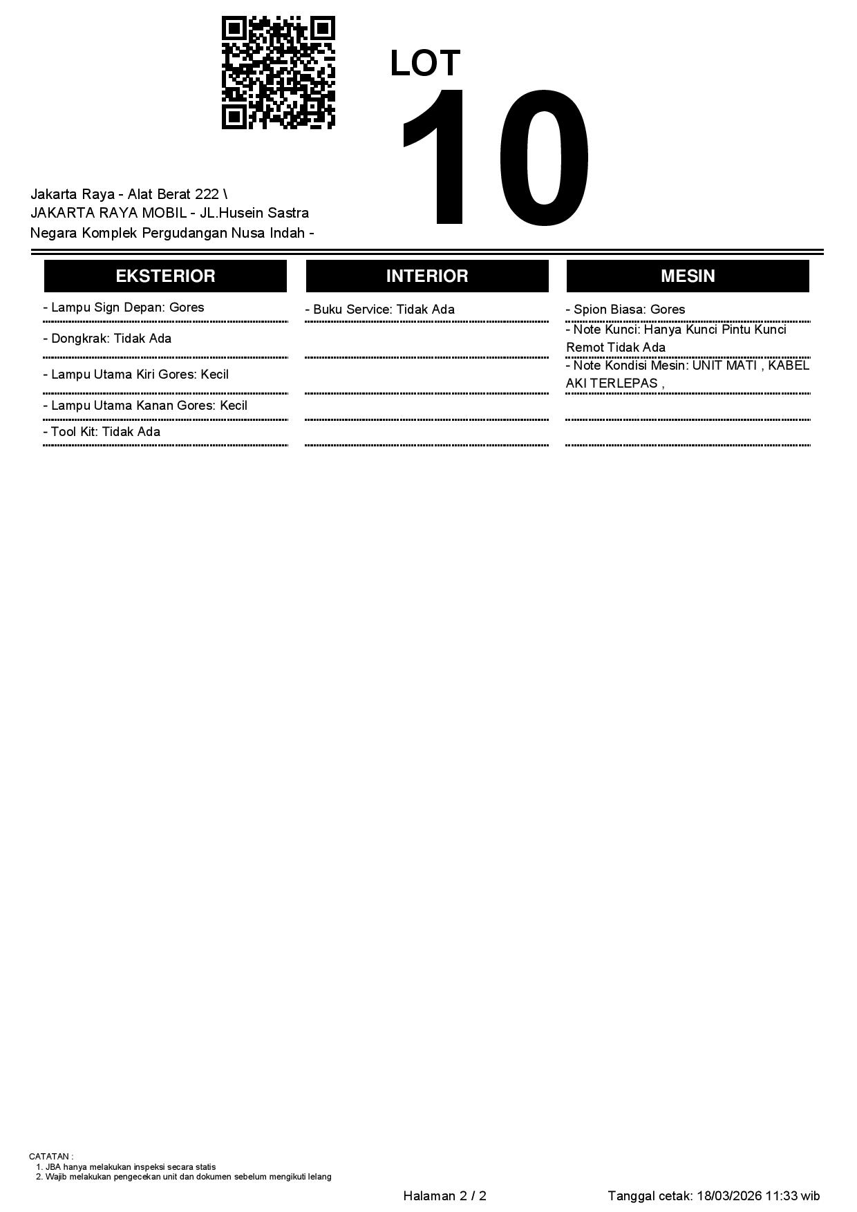 - CatatanWAJIB CEK UNIT & DOKUMEN SECARA LANGSUNG // JBA TIDAK MEMILIKI OPERATOR UNTUK MELAKUKAN INSPEKSI, PESERTA LELANG WAJIB CEK UNIT, DOKUMEN DAN TTD SURAT PERNYATAAN DI JBA //