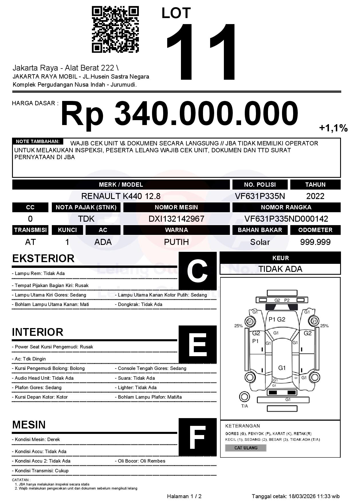 - CatatanWAJIB CEK UNIT & DOKUMEN SECARA LANGSUNG // JBA TIDAK MEMILIKI OPERATOR UNTUK MELAKUKAN INSPEKSI, PESERTA LELANG WAJIB CEK UNIT, DOKUMEN DAN TTD SURAT PERNYATAAN DI JBA