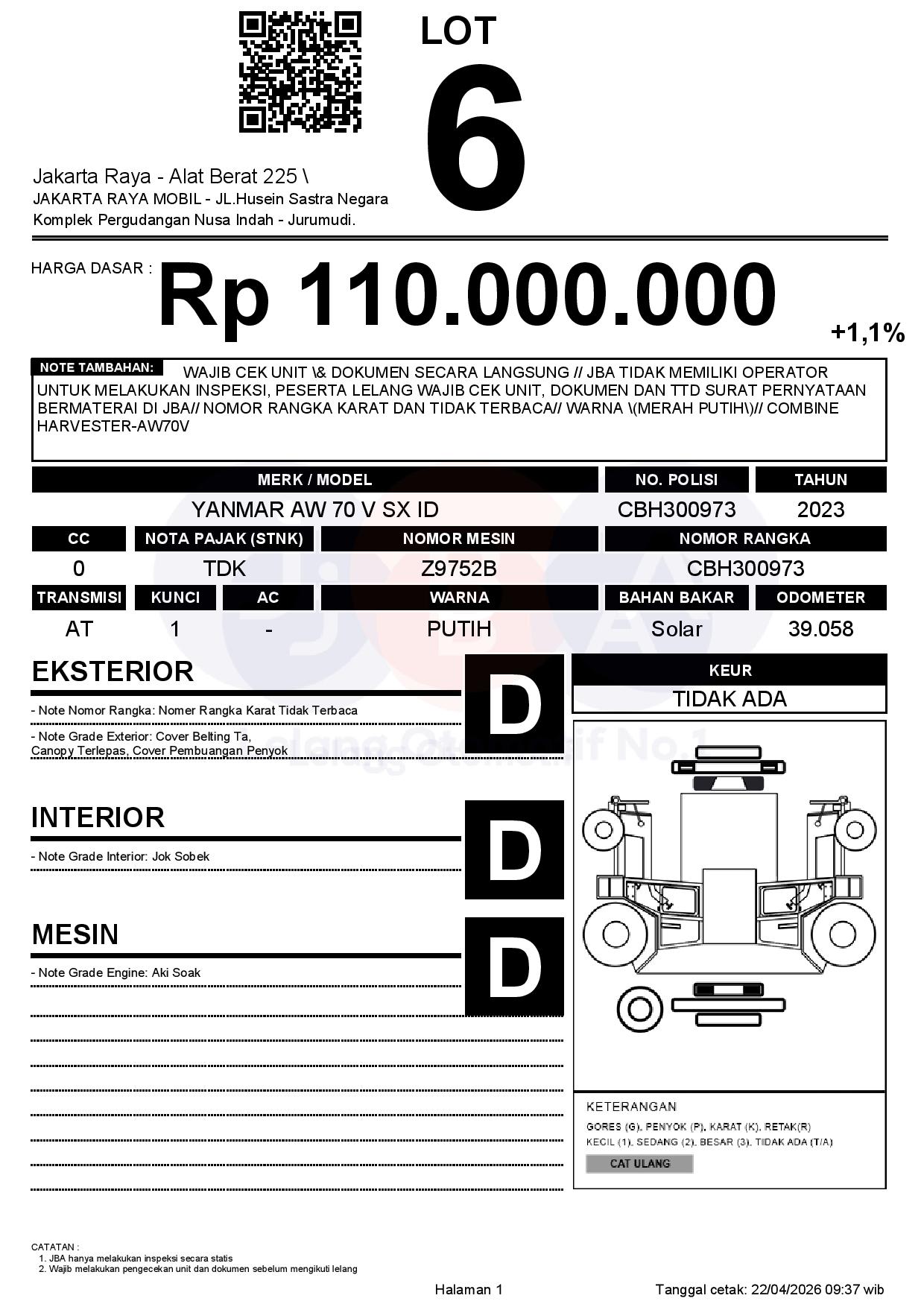 - CatatanWAJIB CEK UNIT & DOKUMEN SECARA LANGSUNG // JBA TIDAK MEMILIKI OPERATOR UNTUK MELAKUKAN INSPEKSI, PESERTA LELANG WAJIB CEK UNIT, DOKUMEN DAN TTD SURAT PERNYATAAN BERMATERAI DI JBA// NOMOR RANGKA KARAT DAN TIDAK TERBACA// WARNA (MERAH PUTIH)// COMBINE HARVESTER-AW70V
