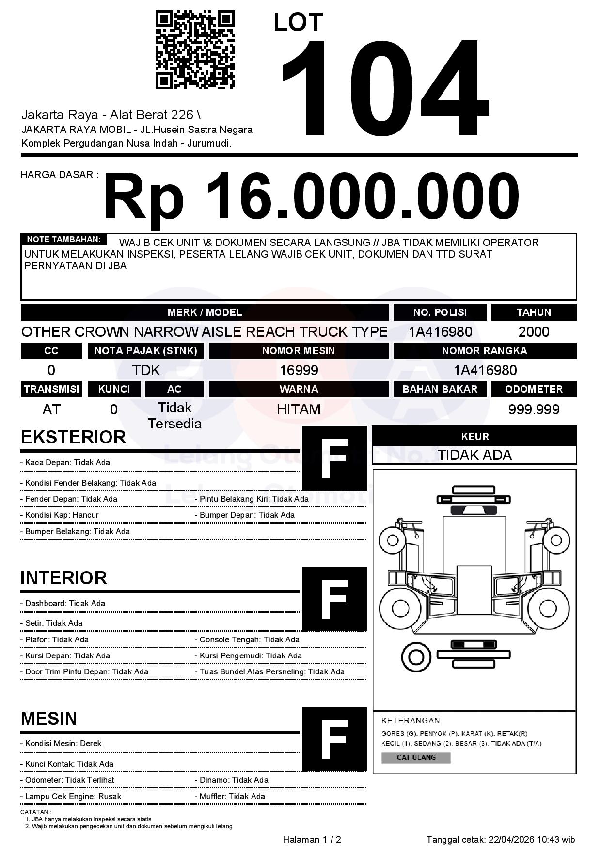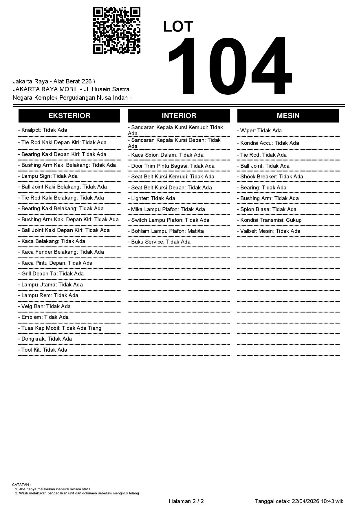 - CatatanWAJIB CEK UNIT & DOKUMEN SECARA LANGSUNG // JBA TIDAK MEMILIKI OPERATOR UNTUK MELAKUKAN INSPEKSI, PESERTA LELANG WAJIB CEK UNIT, DOKUMEN DAN TTD SURAT PERNYATAAN DI JBA