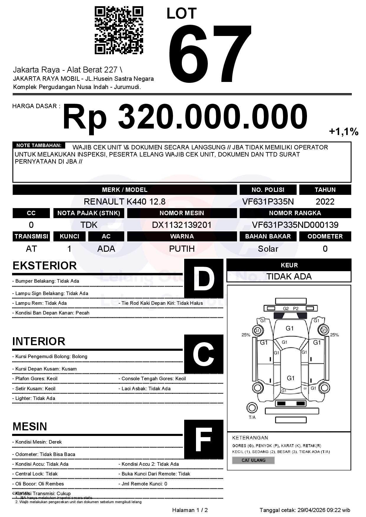 - CatatanWAJIB CEK UNIT & DOKUMEN SECARA LANGSUNG // JBA TIDAK MEMILIKI OPERATOR UNTUK MELAKUKAN INSPEKSI, PESERTA LELANG WAJIB CEK UNIT, DOKUMEN DAN TTD SURAT PERNYATAAN DI JBA //