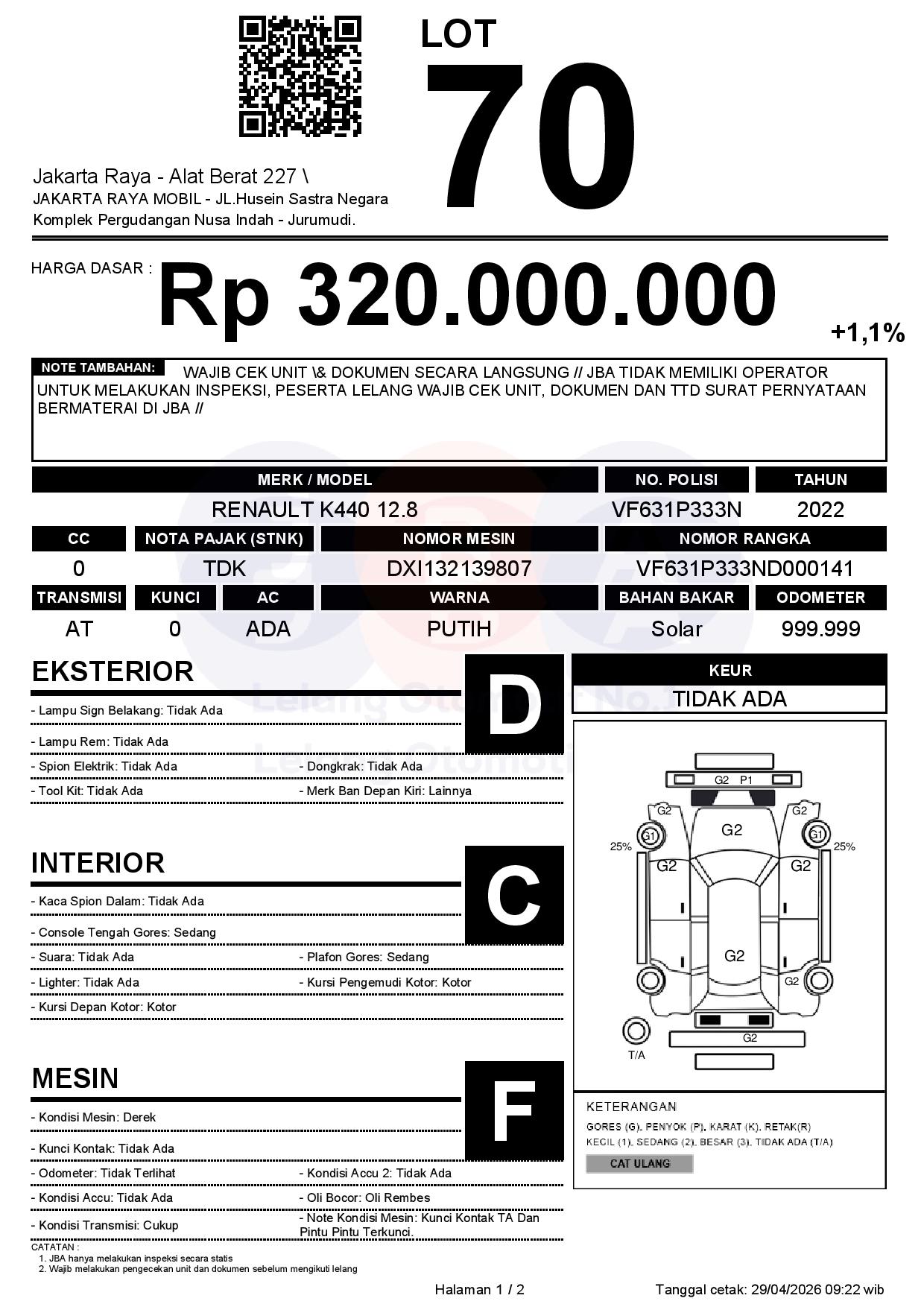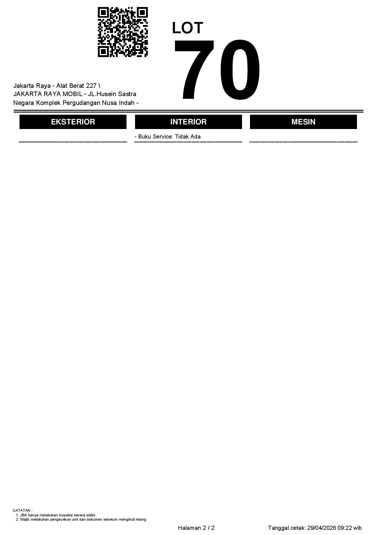 - CatatanWAJIB CEK UNIT & DOKUMEN SECARA LANGSUNG // JBA TIDAK MEMILIKI OPERATOR UNTUK MELAKUKAN INSPEKSI, PESERTA LELANG WAJIB CEK UNIT, DOKUMEN DAN TTD SURAT PERNYATAAN BERMATERAI DI JBA //