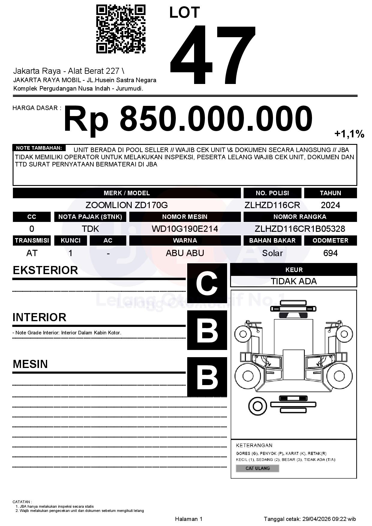 - CatatanUNIT BERADA DI POOL SELLER // WAJIB CEK UNIT & DOKUMEN SECARA LANGSUNG // JBA TIDAK MEMILIKI OPERATOR UNTUK MELAKUKAN INSPEKSI, PESERTA LELANG WAJIB CEK UNIT, DOKUMEN DAN TTD SURAT PERNYATAAN BERMATERAI DI JBA