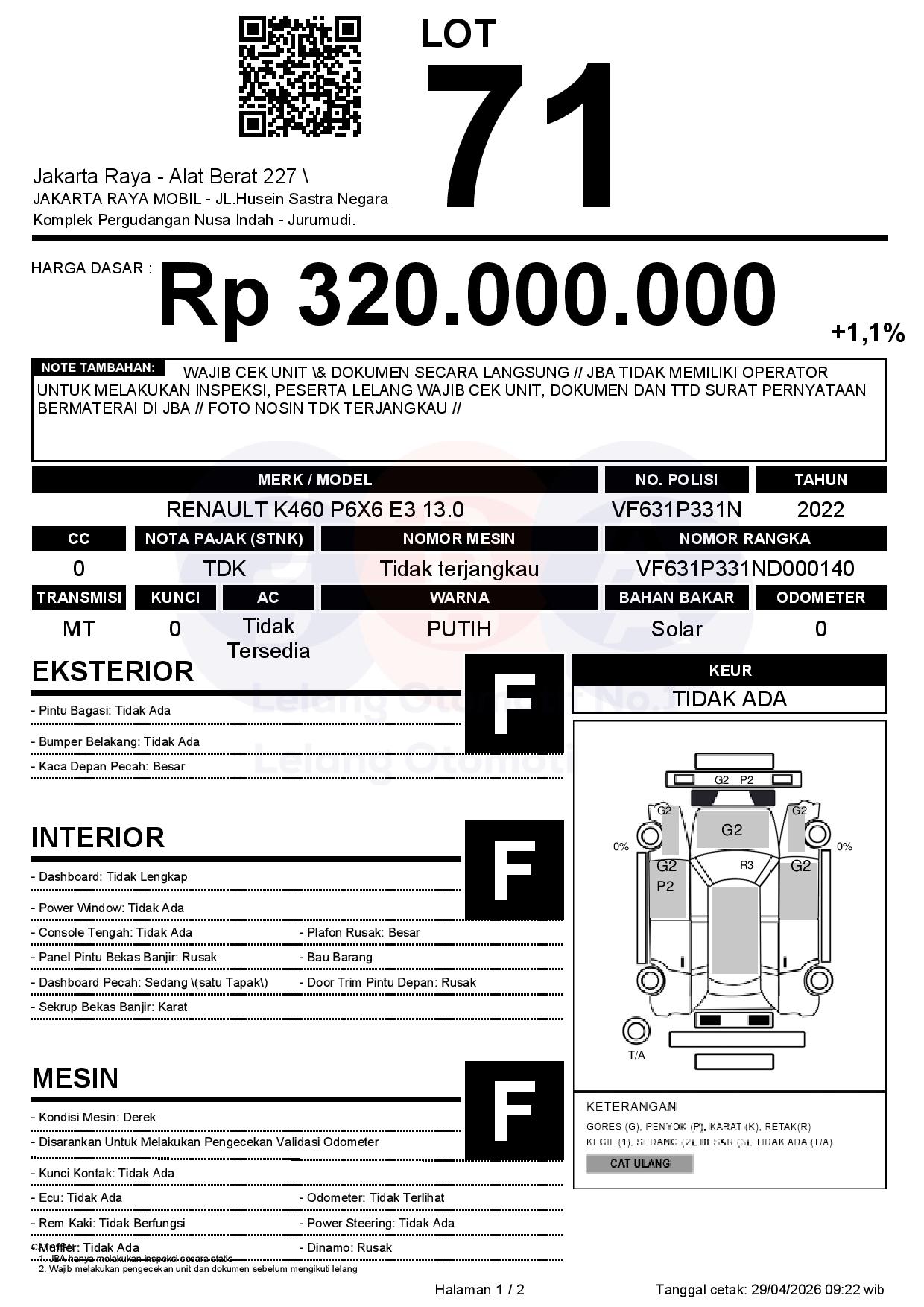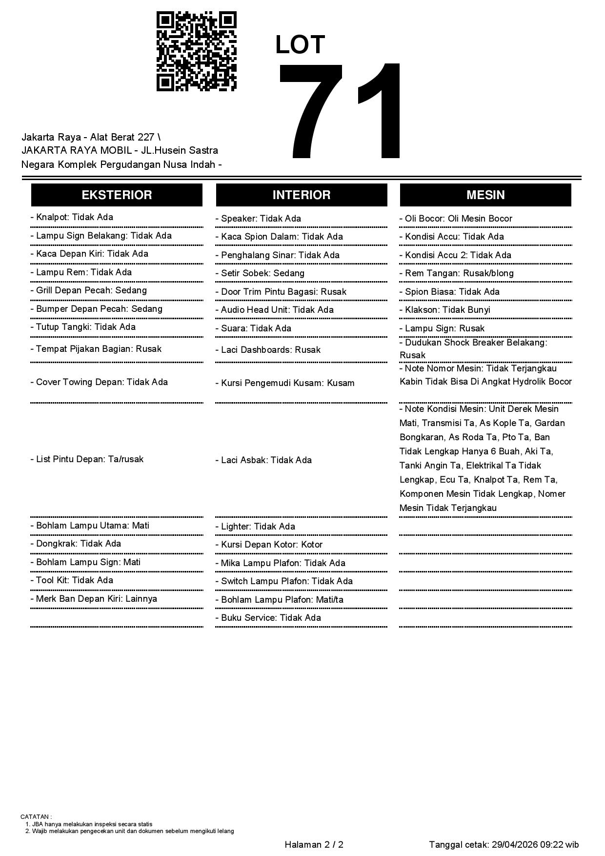 - CatatanWAJIB CEK UNIT & DOKUMEN SECARA LANGSUNG // JBA TIDAK MEMILIKI OPERATOR UNTUK MELAKUKAN INSPEKSI, PESERTA LELANG WAJIB CEK UNIT, DOKUMEN DAN TTD SURAT PERNYATAAN BERMATERAI DI JBA // FOTO NOSIN TDK TERJANGKAU //