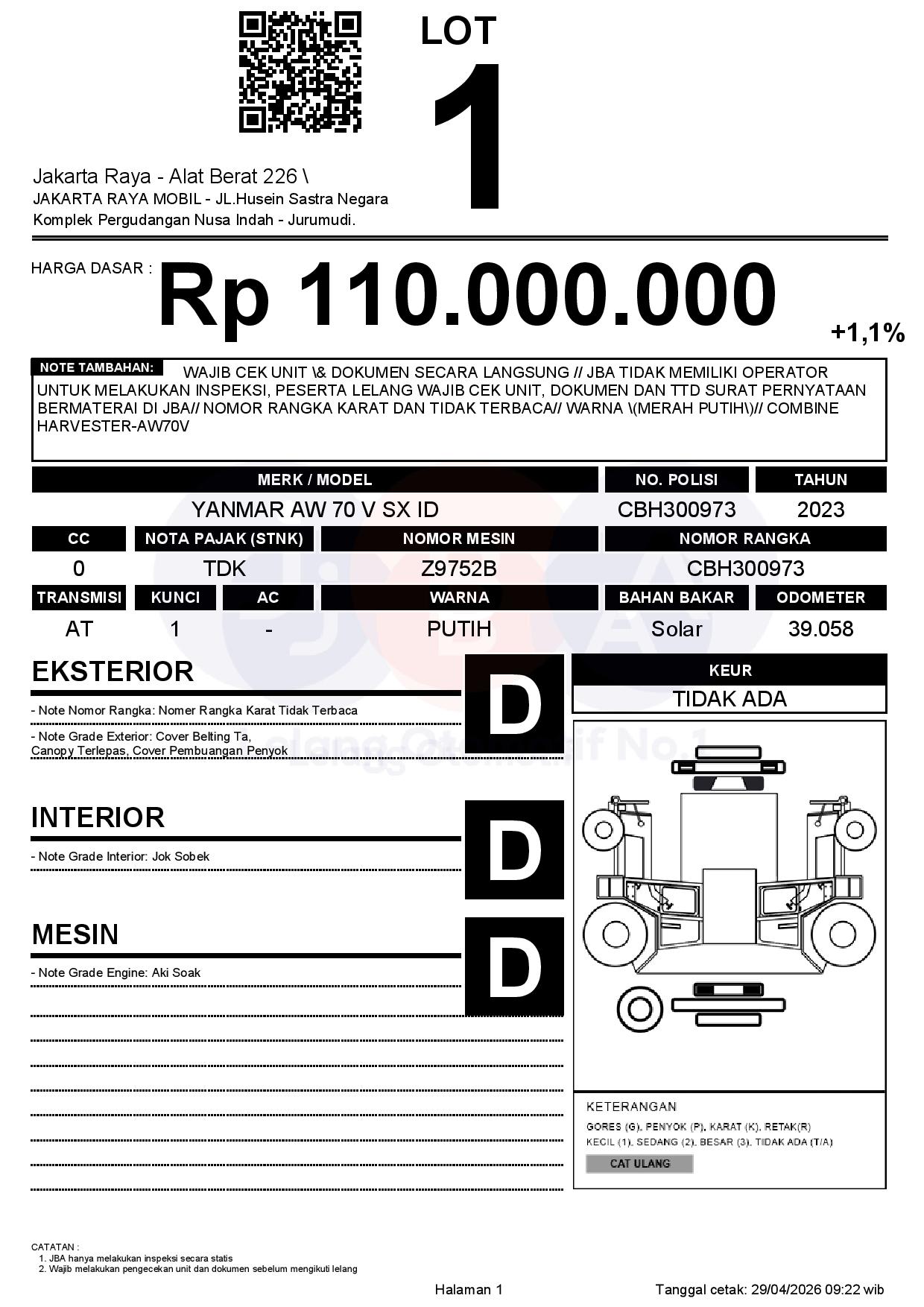 - CatatanWAJIB CEK UNIT & DOKUMEN SECARA LANGSUNG // JBA TIDAK MEMILIKI OPERATOR UNTUK MELAKUKAN INSPEKSI, PESERTA LELANG WAJIB CEK UNIT, DOKUMEN DAN TTD SURAT PERNYATAAN BERMATERAI DI JBA// NOMOR RANGKA KARAT DAN TIDAK TERBACA// WARNA (MERAH PUTIH)// COMBINE HARVESTER-AW70V