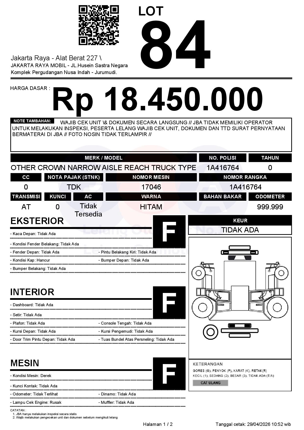 - CatatanWAJIB CEK UNIT & DOKUMEN SECARA LANGSUNG // JBA TIDAK MEMILIKI OPERATOR UNTUK MELAKUKAN INSPEKSI, PESERTA LELANG WAJIB CEK UNIT, DOKUMEN DAN TTD SURAT PERNYATAAN BERMATERAI DI JBA // FOTO NOSIN TIDAK TERLAMPIR //